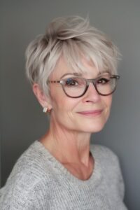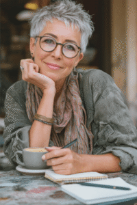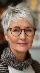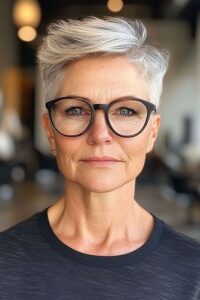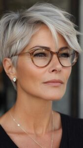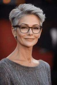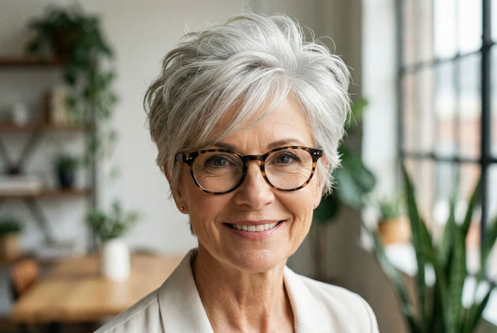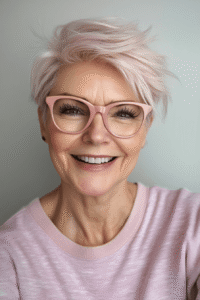 Oser la coupe pixie, c’est faire le choix d’une sophistication absolue. En dégageant le visage et le cou, cette coupe cheveux femme 60 ans lunettes met délicatement en lumière la ligne de la mâchoire tout en sublimant votre monture.