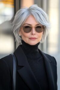 Assumer ses cheveux blancs est un vrai parti pris de style, croyez-moi. Vos lunettes deviennent alors un accessoire de mode indispensable pour rehausser l’ensemble avec élégance.