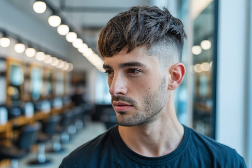 Cette coiffure se distingue par une architecture à la fois nette et texturée, idéale pour l’homme moderne. Elle associe des côtés courts, souvent travaillés en dégradé, à une longueur conservée sur le dessus du crâne qui est coiffée vers l’avant pour former une frange droite ou effilée sur le front.